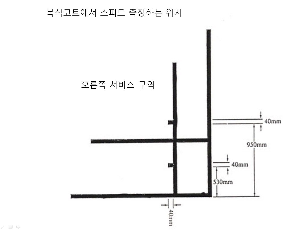 정확한 스피드를 가지고 있는 셔틀을 사용했을 경우 그림에 나타나듯이 반대편 백바운더리라인 내측 530mm이상 990mm아래의 범위에 착지된다.