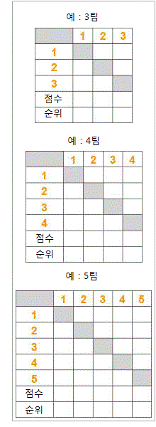 4. 만약 3팀 혹은 그 이상의 팀의 점수가 같을 때 판정 하는 방법은 3가지가 있다. 주최측은 한 가지를 선택하여 판정 하면 된다.